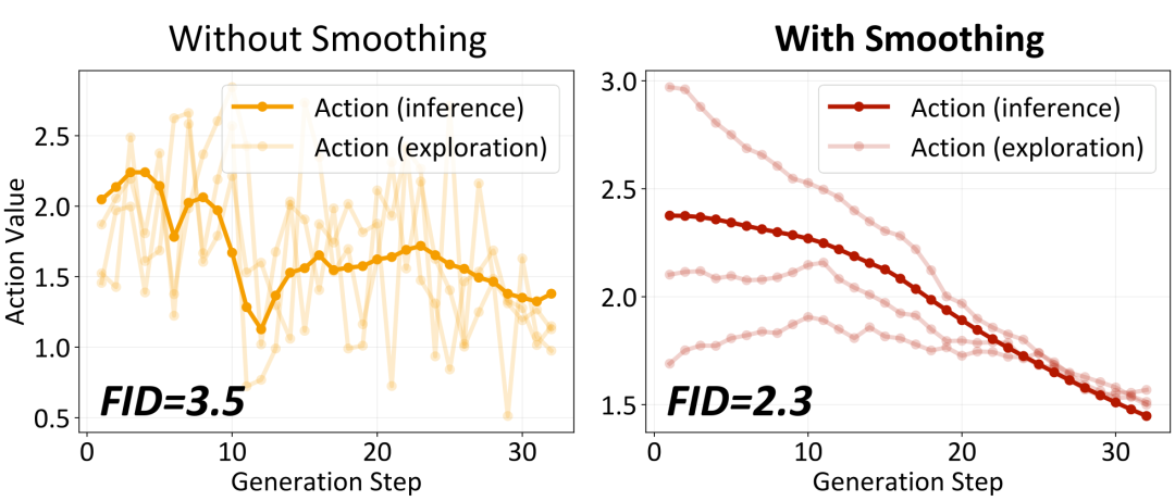 左侧未平滑时策略剧烈抖动(FID=3.5);右侧平滑后策略合理稳定(FID=2.3)