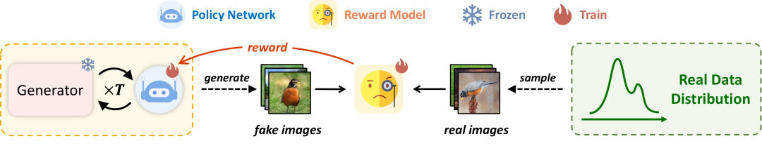 最终方案:引入一个判别器作为奖励模型,与策略网络进行对抗训练。策略网络试图最大化奖励,判别器不断提高区分真假图像的标准,类似 GAN 的博弈过程。