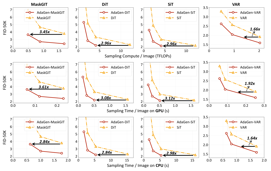 无论是理论计算量(TFLOPs)还是实际 GPU/CPU 推理时延,AdaGen 均能推进质量-效率前沿