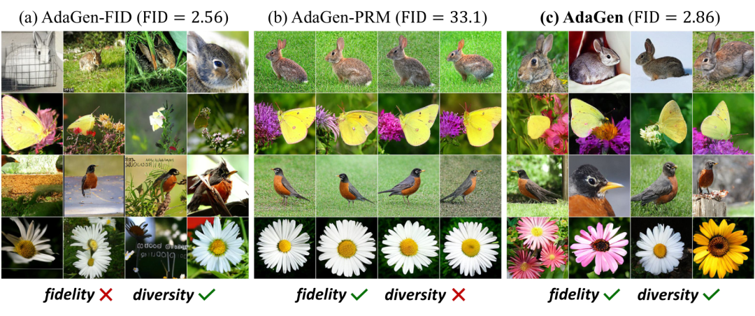 (a)用 FID 作奖励:指标虽低但图像质量差;(b)用预训练奖励模型:保真度好但多样性不足;(c)AdaGen 的对抗奖励:保真度与多样性兼顾