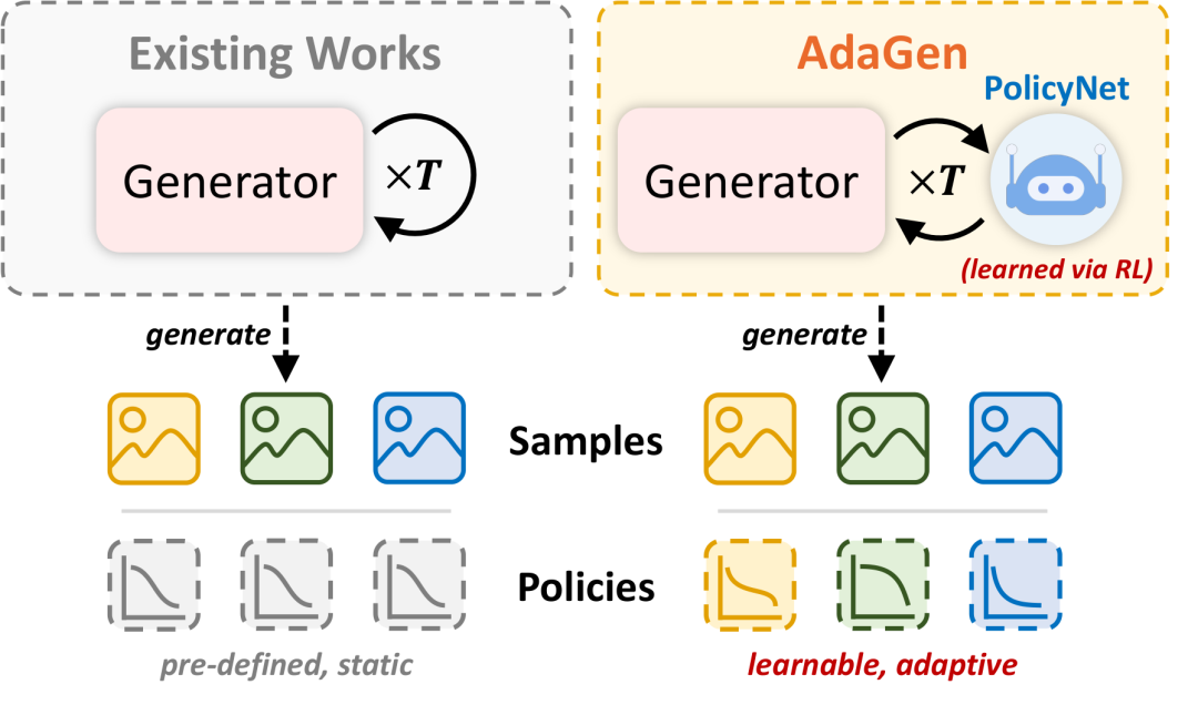 左侧是传统方法:所有样本共享预定义的静态策略;右侧是 AdaGen:通过策略网络为每个样本动态生成定制化策略