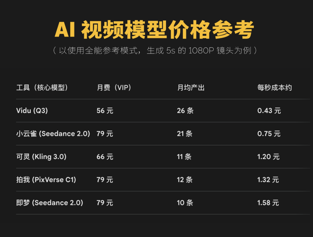 上图是主流AI视频生成工具的价格对比,建议收藏备用。