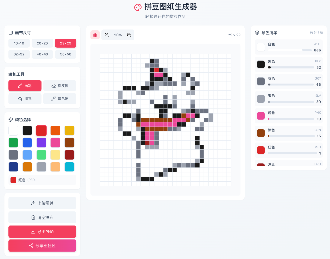 上传图片后自动生成拼豆图纸。三栏布局(左侧功能区、中间画布、右侧统计区),内置画笔、橡皮擦、填充、取色器四大工具。