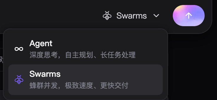 平台提供 Agent 模式和蜂群 Agent 模式。蜂群模式支持多个 Agent 并行处理任务,最快 1 分钟自动生成页面。实测中,H5 应用创建会自动开启蜂群模式,4 个任务同步并行。