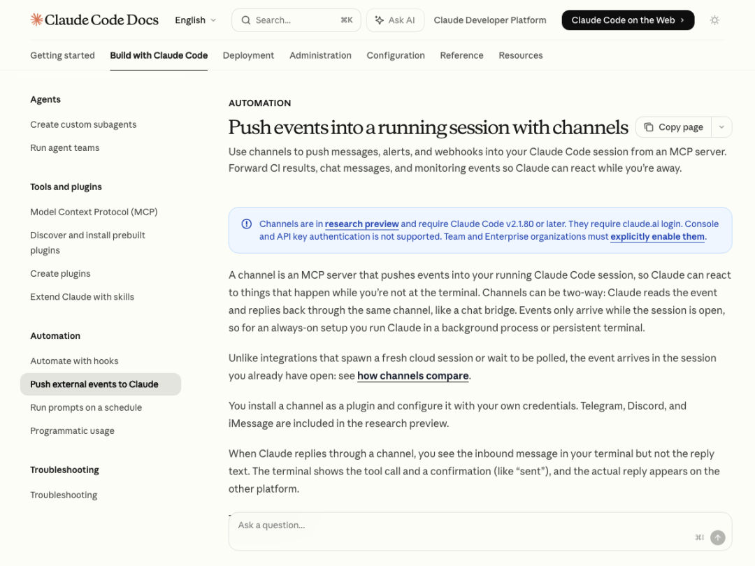 官方文档:https://code.claude.com/docs/en/channels