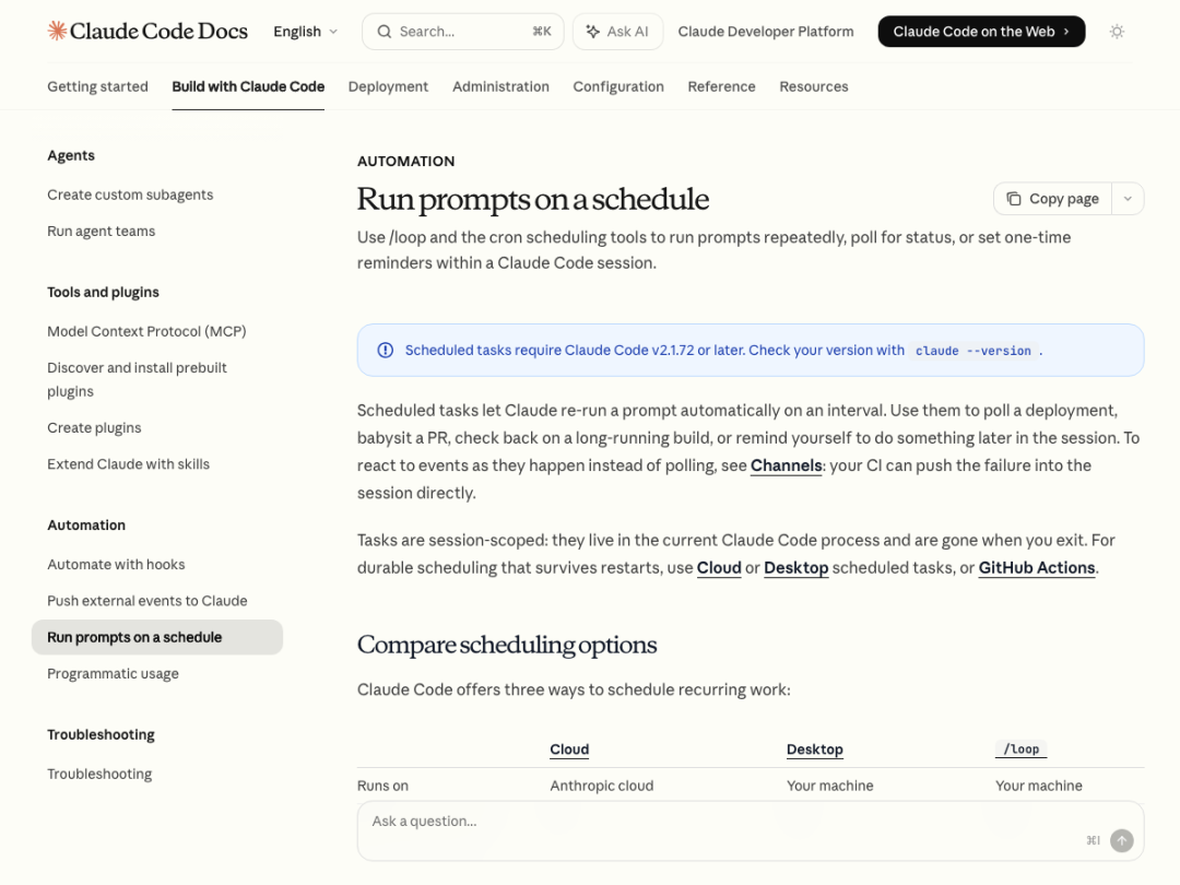 选择建议:短期监控用 /loop,长期自动化用 /schedule。v2.1.71,3 月 7 日发布。