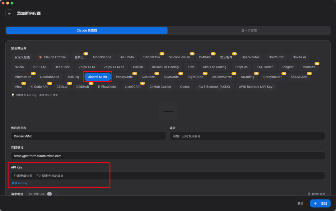 前往小米开放平台注册并申请 MiMo 模型的 API Key。