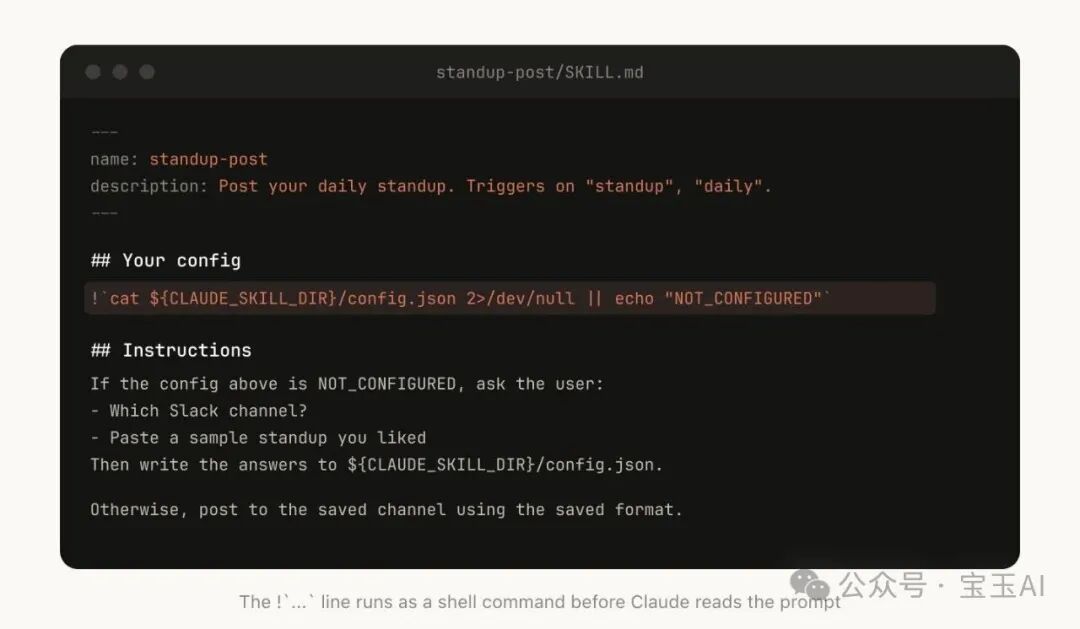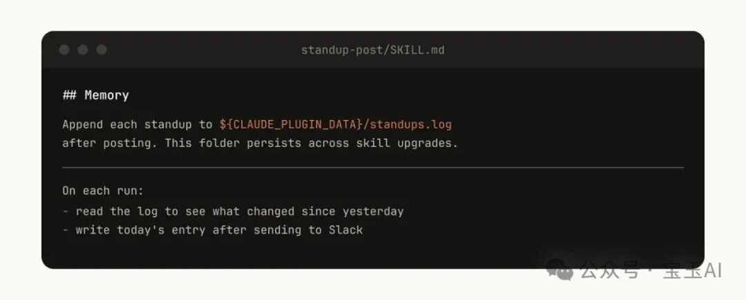 例如,一个 standup-post Skill 可以保留一份 standups.log,记录它写过的每一条站会汇报。这样下次运行时,Claude 会读取自己的历史记录,就能知道从昨天到现在发生了什么变化。