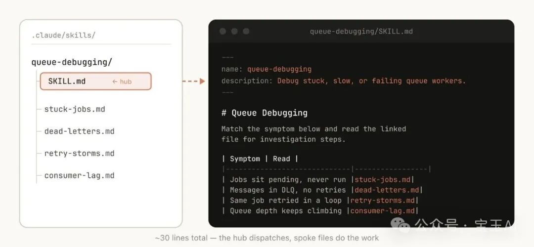 Skill 是一个文件夹,不只是一个 markdown 文件。你应该把整个文件系统当作上下文工程和渐进式披露的工具。告诉 Claude 你的 Skill 里有哪些文件,它会在合适的时候去读取它们。