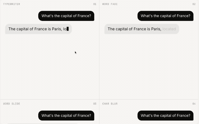 Claude Design 能为文字添加火、烟、金属、风、雪等粒子特效,也能一次性生成 11 种文本流动画(打字机、渐隐、滑入、模糊、弹出等)。
