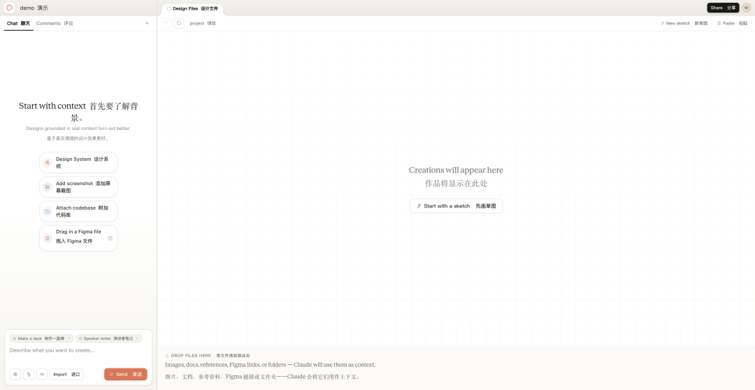 访问 https://claude.ai/design 进入 Claude Design。左侧是对话窗口,右侧可以先画草图让 Claude 基于草图完成设计。
