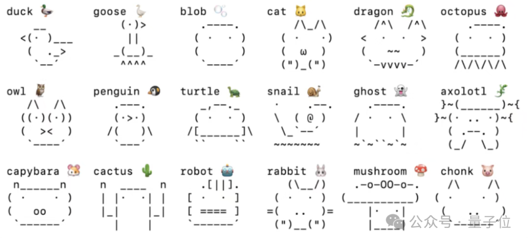 内置 18 种 ASCII 小动物形象,每种都有完整动画