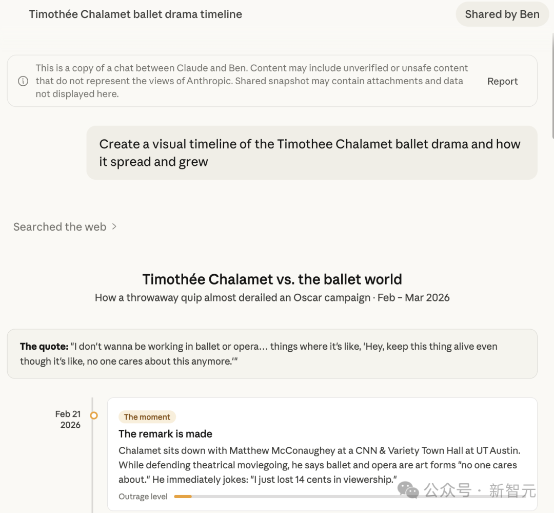 有记者测试了让Claude生成Timothée Chalamet争议事件的交互式时间线,它不仅做了完整的事件节点可视化,还自己加了一个"愤怒指数"仪表盘。