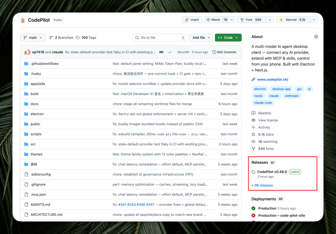 前往 Codepilot 的 GitHub Releases 页面 下载对应平台的安装包。