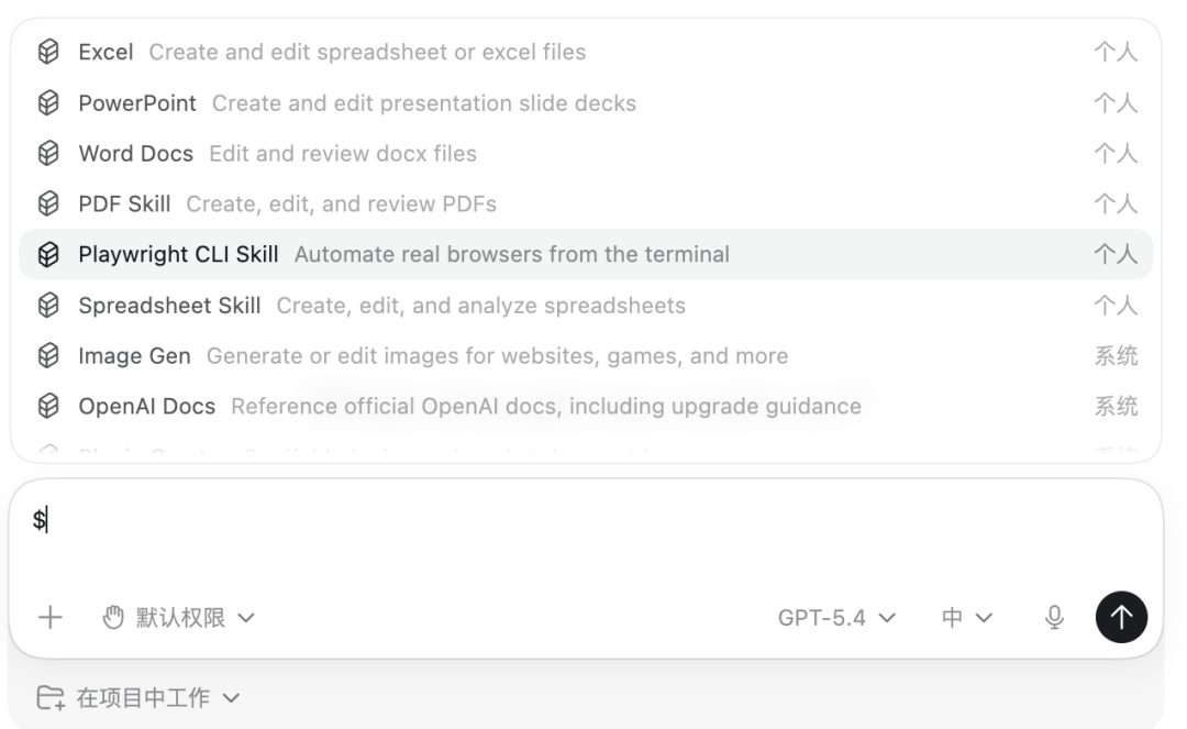 在 Codex 中输入 / 可快速进入配置,输入 $ 可选择不同的 Skills(包括本地安装的)。