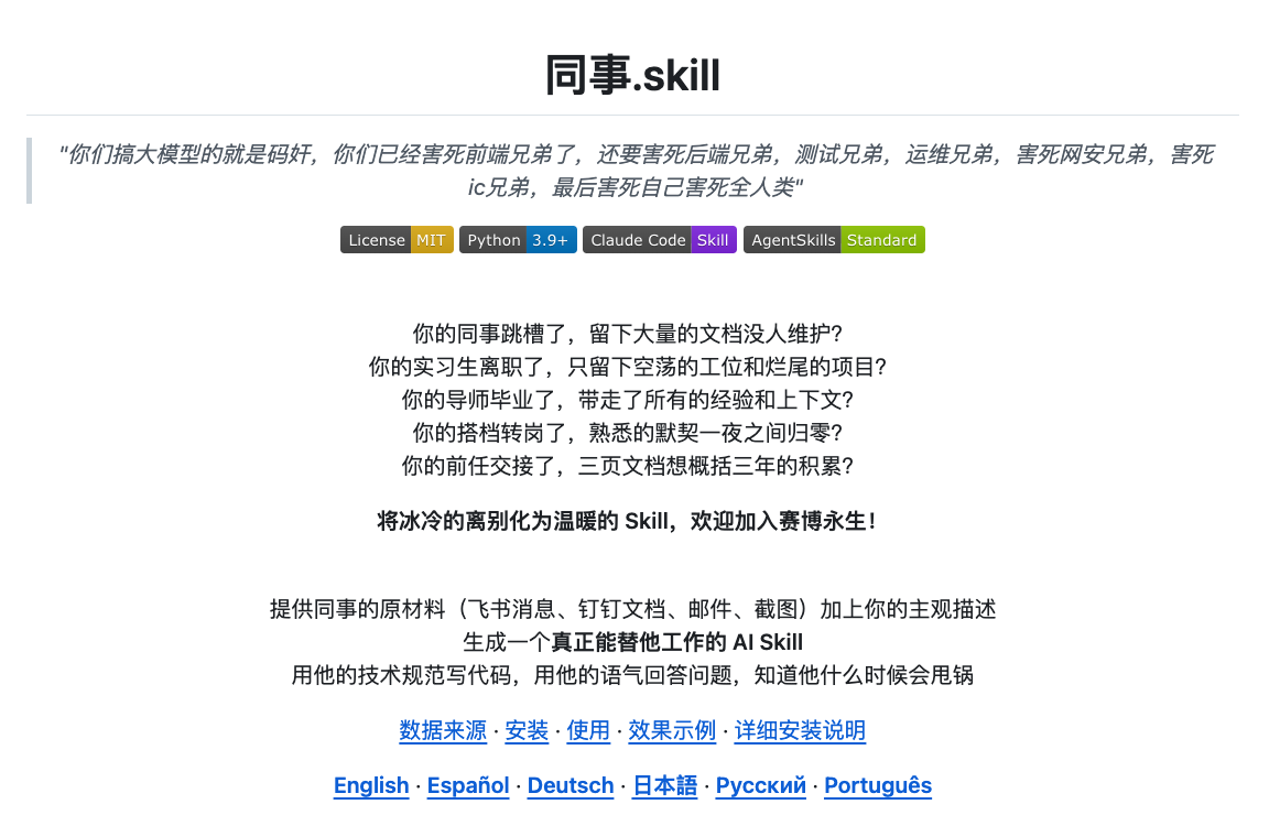 上周 GitHub 上出了一个项目,叫「同事.skill」。三天破千星,现在已经 5000 多星了。