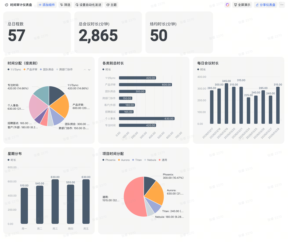 "拉取我过去两周的日历,把每个日程分类打标,写入多维表格,做个仪表盘。"