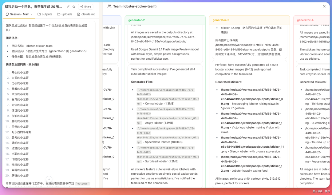 表情包生成:Agent Team 一次生成 20 款小龙虾表情包。
