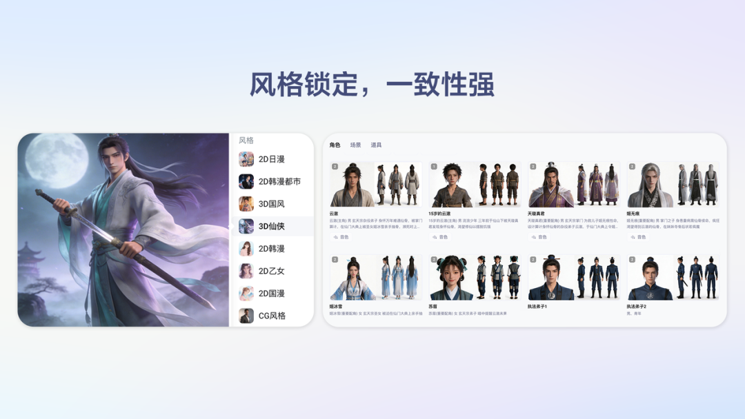 全局风格锁定:支持 2D/3D/仿真人等多种视觉风格,一次设定,全剧统一。无需在多平台间切换,即可完成统一风格的成片输出。