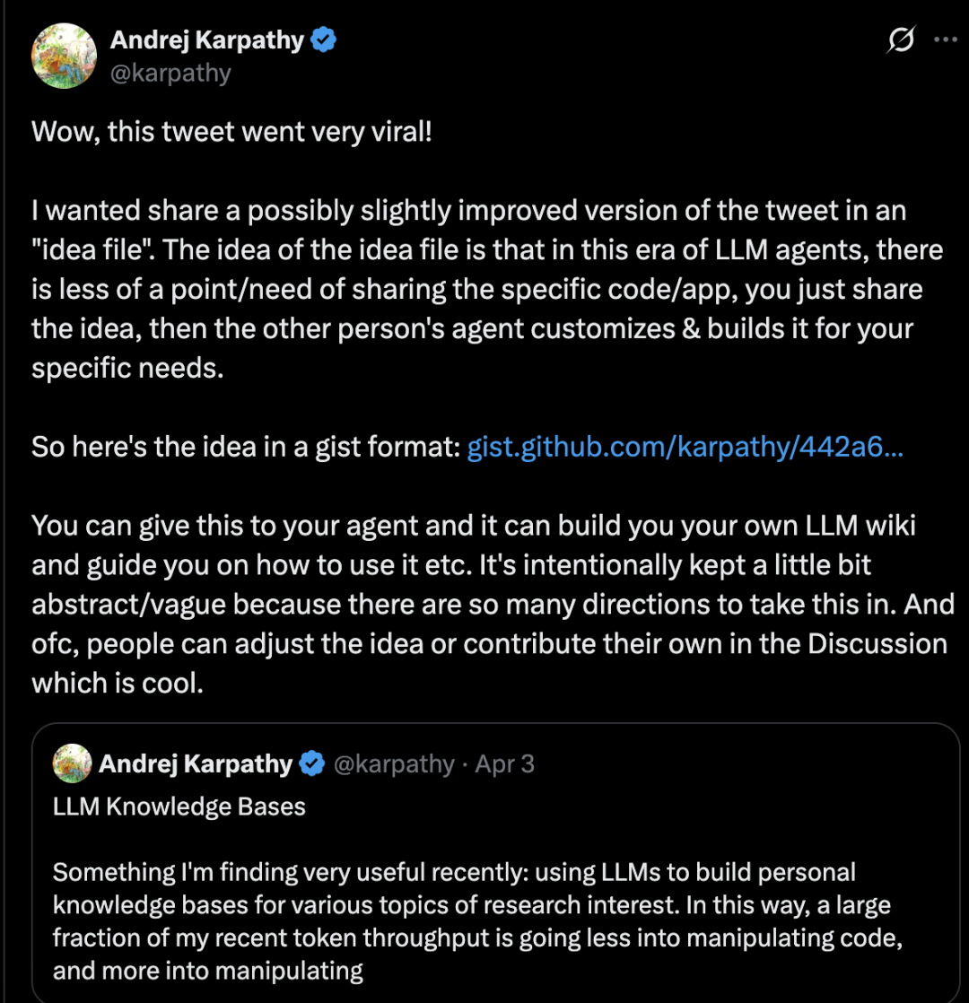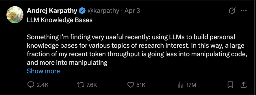 Andrej Karpathy 分享了他的 LLM Wiki 工作流,用 Markdown 文件 + Claude Code 替代复杂的 RAG 架构,构建可演化的个人知识库。