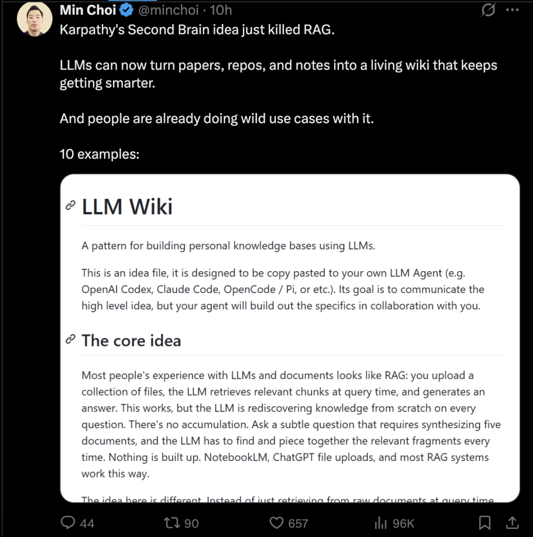 Karpathy 的方法与 RAG 的根本区别在于思路: