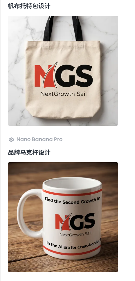 帆布包、马克杯,logo 位置和品牌色运用都很到位。