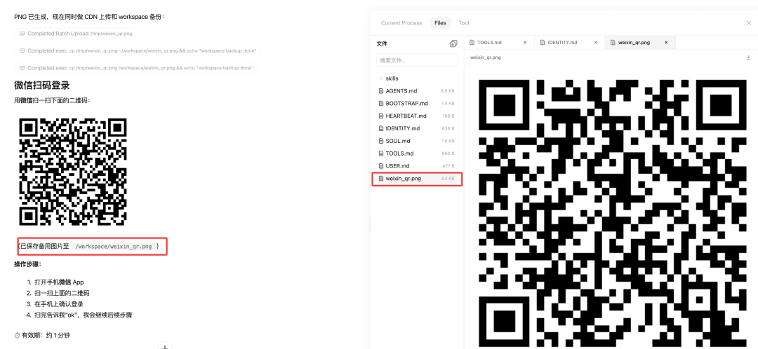 Files:/workspace 中查看(默认文件名为 weixin_qr.png)