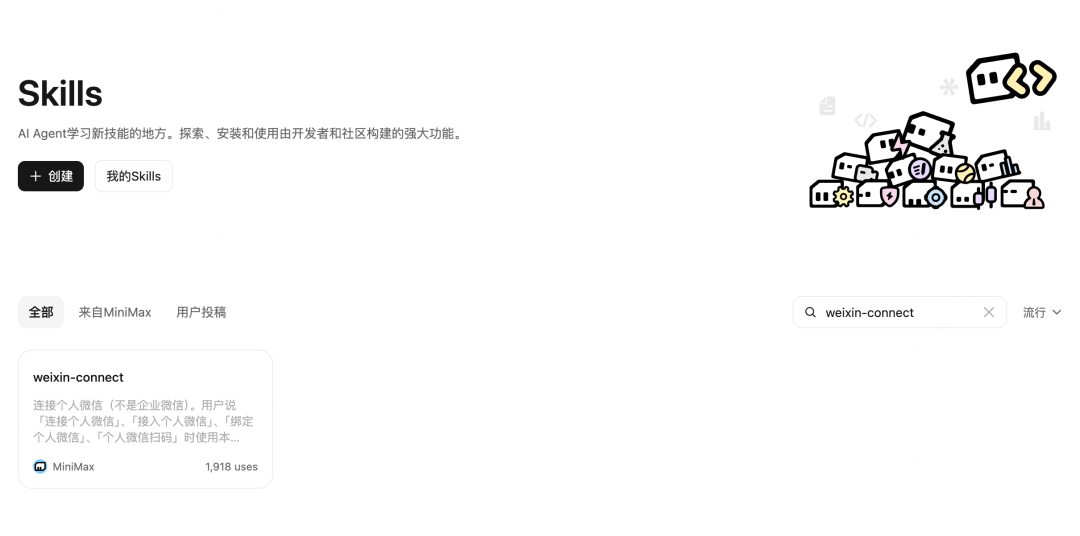 打开 MaxClaw 网页端,进入 Skills 社区,搜索 weixin-connect 并添加到技能库。