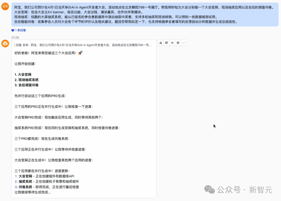 开发者「言非」又给龙虾抛了个正经需求:做一整套「AI in Agent 开发者大会」系统,官网、会后调查问卷、现场大屏抽奖,三个应用一口气全要。