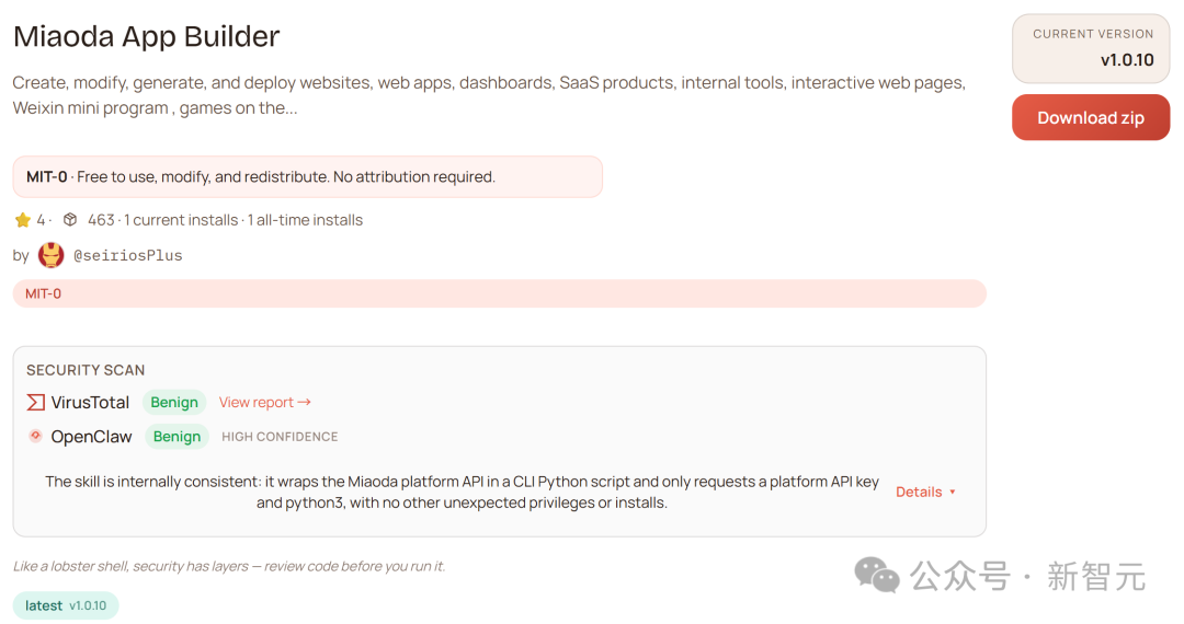 Miaoda App Builder 正式上架 ClawHub,全球首个把完整应用开发能力封装成 Skill 的技能包。