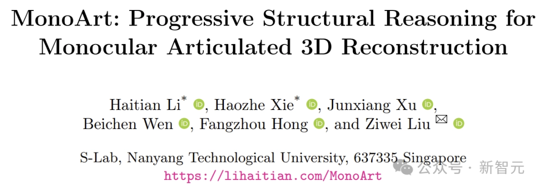 南洋理工大学 S-Lab 团队开源的 MonoArt 解决了这个问题:从单张图片生成既有形状、又有部件层级和关节信息的可交互 3D 模型。整个过程不需要多视角数据、不需要外部资产库、不需要辅助视频生成,推理只需要约 20 秒。