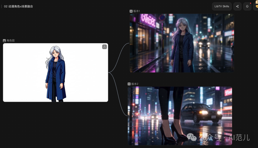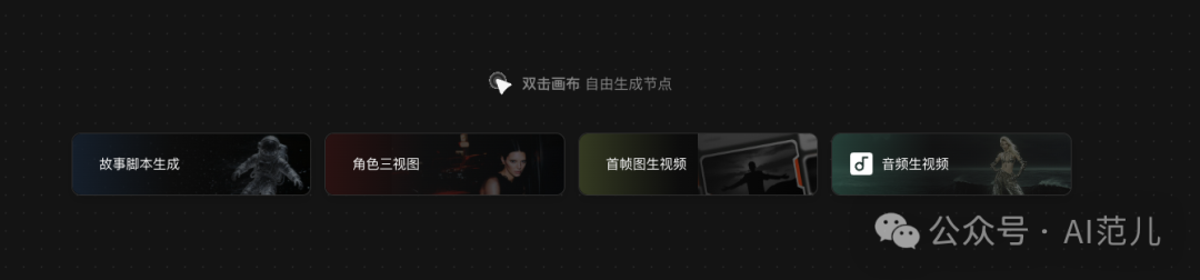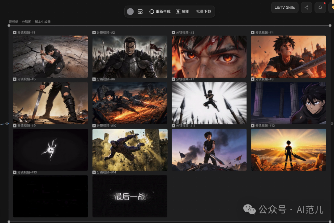 剧本 -> 视频脚本 -> 分镜设计 -> 视频生成 -> 成片全部在 LibTV 一个画布里完成。