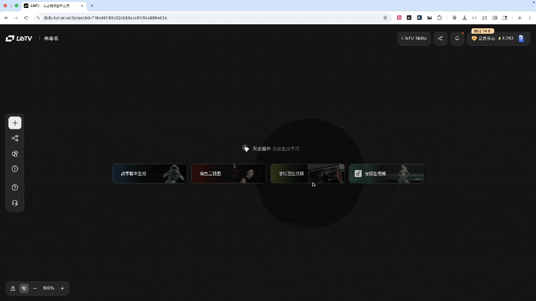 访问 liblib.tv,点击"开始创作"。界面和传统视频编辑器完全不同,是一个无限延伸的画布。