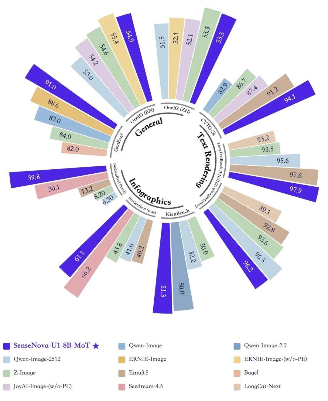 U1在信息图生成基准上的得分与Qwen-Image 2.0、Seedream 4.5等大模型基本持平,但延迟显著更低。