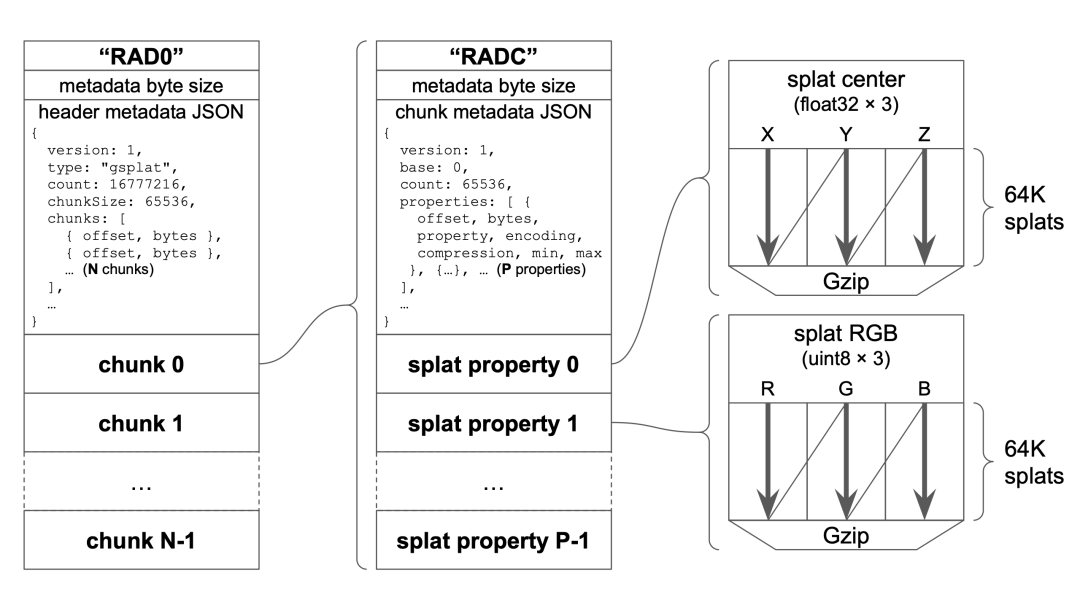 Spark 2.0 设计了新格式 .RAD(RADiance fields)。它把 splat 数据切成每块 64K 个的独立小块,分别压缩,文件头记录所有块的字节偏移位置。