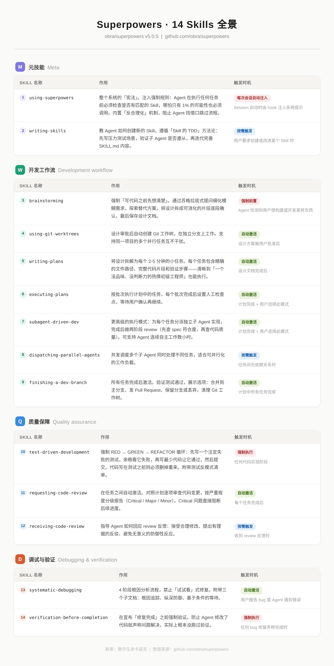 Superpowers 不是传统意义上的工具,更像是一套指导 Agent 如何完成任务的系统。它通过 14 个 Skills 的组合,在 Agent 的执行链路里强行插入一套结构化工作流:
