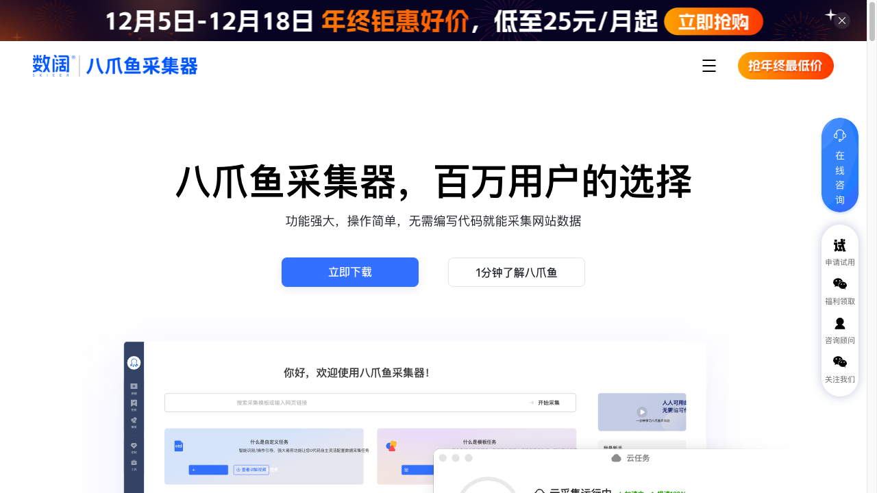 八爪鱼采集器是深圳视界信息技术有限公司开发的一款可视化网页数据采集工具,基于分布式云计算平台和智能识别算法,无需编写代码即可实现网页数据的自动化采集。该工具拥有超过10年的大数据服务经验,已服务450万+用户和1万+企业客户。