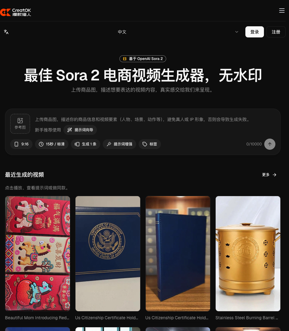 CreatOK 是基于 OpenAI Sora 2 的电商视频生成平台,专为电商卖家和社媒创作者打造。它解决了官方 Sora 的三大痛点:有水印、需邀请码、价格高昂($200/月)。