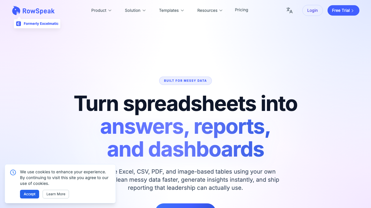Excelmatic(现更名 RowSpeak)是一款专为非技术人员打造的AI数据分析助手,致力于让枯燥的电子表格变为可对话的“数据专家”。它巧妙填补了通用大语言模型易出错与传统BI工具门槛过高之间的空白,让任何人只需通过自然语言就能轻松从杂乱数据中提取有价值的商业洞察。无论你是销售、财务还是市场人员,都能在几分钟内完成专业级的数据处理与可视化。