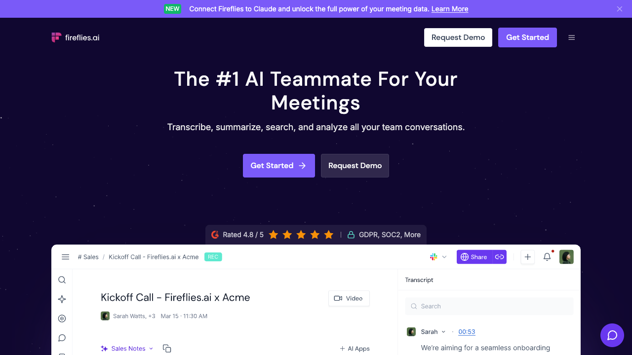 独特优势 相比同类产品,Fireflies.ai在噪音环境和多人对话场景下表现出色,其AI摘要质量和可定制性明显领先于竞争对手。平台采用企业级安全标准,符合GDPR和SOC2合规要求,在医疗健康等高标准行业也提供HIPAA合规版本。