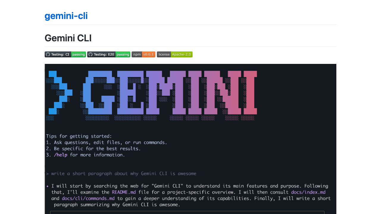 Gemini CLI是Google官方推出的开源AI代理工具,它将强大的Gemini模型能力直接集成到开发者的终端环境中,为命令行操作提供AI增强功能。该工具基于Gemini 2.5 Pro模型,拥有100万token的超长上下文窗口,能够理解和处理大型代码库。