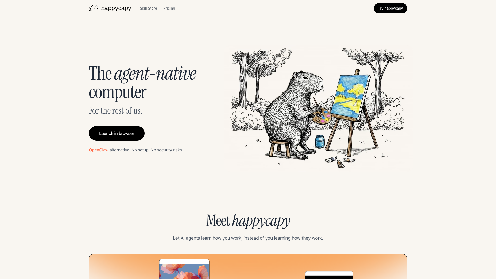 Happycapy is an Agent-Native Computer that runs in your browser. It lets AI agents learn your workflow instead of you learning theirs—zero config, no security risks like OpenClaw's ClawHub.