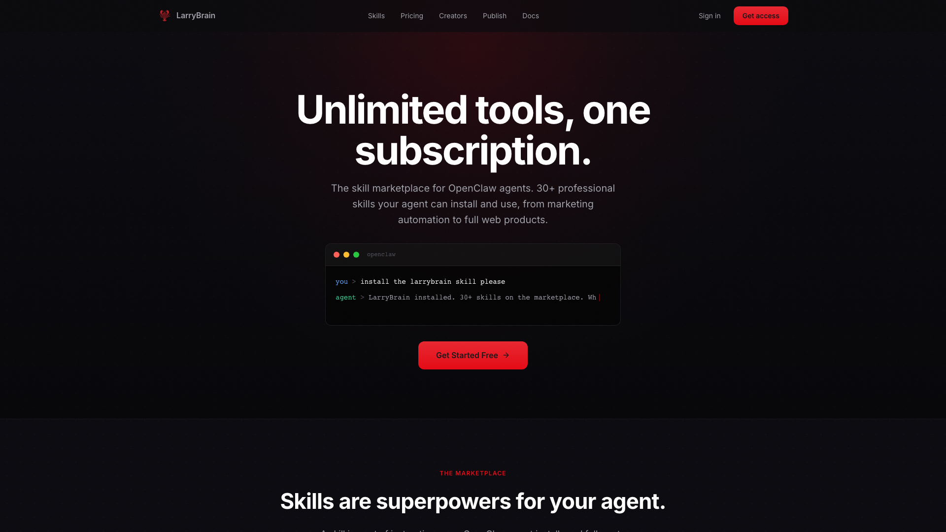 LarryBrain 是专为 OpenClaw AI Agent 打造的精选技能市场,由英国独立开发者 Oliver Henry 于 2026 年 2 月创立。核心主张「SaaS 已死」——一份订阅替代多工具,所有技能本地运行,API 密钥不离开你的设备。