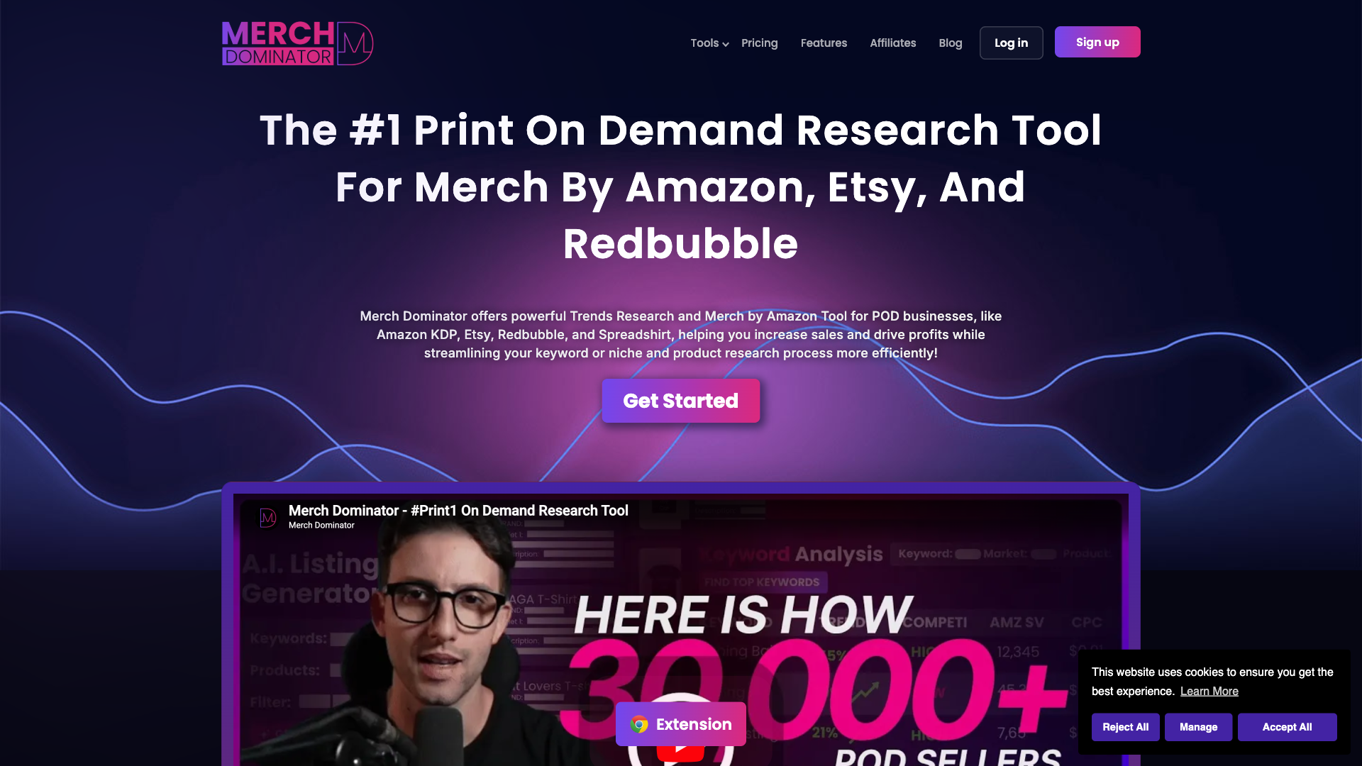 Merch Dominator 是 Blancutes Ltd 推出的全方位 POD(按需印刷)市场研究平台,专为 Amazon Merch、Etsy、Redbubble 卖家设计。80,000+ 用户验证,Chrome 扩展获 4.9 星评分,这个工具将数小时的市场研究压缩到几分钟,帮助卖家在"速度即收入"的 POD 领域抢占先机。