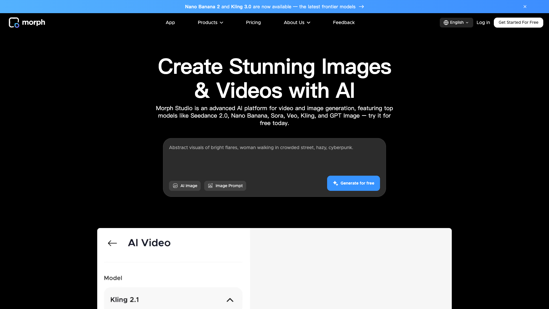 Morph Studio 是集成了 Sora 2、Veo 3.1、Kling 3.0、Seedance 2.0 等 15+ 顶尖 AI 模型的一体化视频生成平台,专为独立创作者、营销人员和小企业打造。无需订阅多个服务,一个账户即可切换使用业界最前沿的视频生成模型,显著降低成本和管理复杂度。