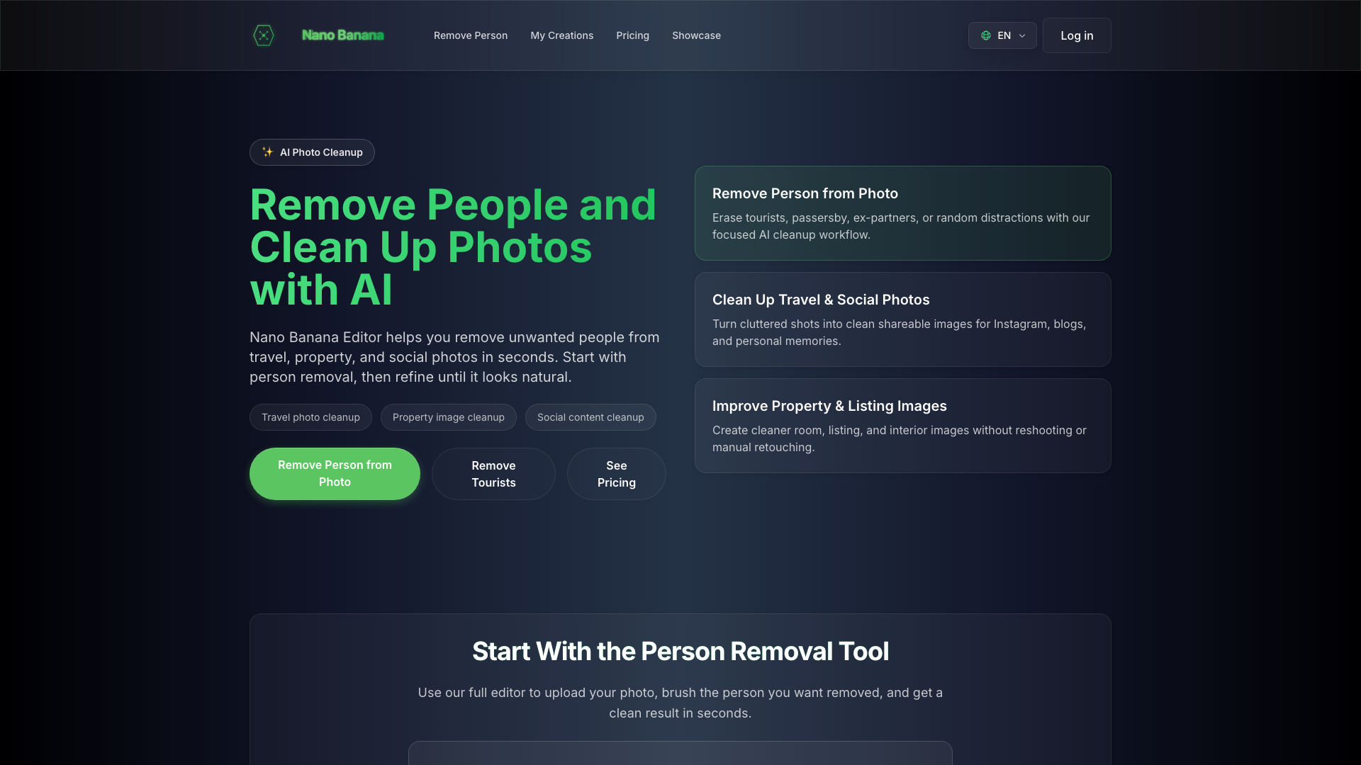 Nano Banana Editor 是一款专注于从照片中移除人物的 AI 图像编辑工具,通过人工智能自动识别并移除不需要的人物,同时智能填充背景,使编辑后的照片自然无痕。这款工具为旅行摄影、房地产和团体照三大场景提供专门优化的工作流程。