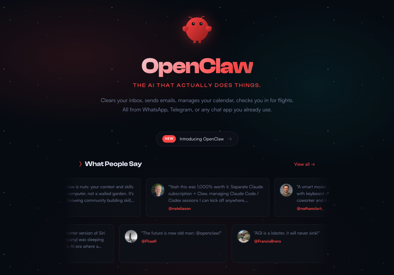 OpenClaw 是 Peter Steinberger 开发的开源个人AI助手,核心理念是「真正能执行任务的AI」——不仅能理解指令,还能实际执行操作。与传统的对话式AI不同,它通过 WhatsApp、Telegram、Discord 等熟悉的聊天应用访问,数据完全存储在本地,专为重视隐私和技术用户打造。