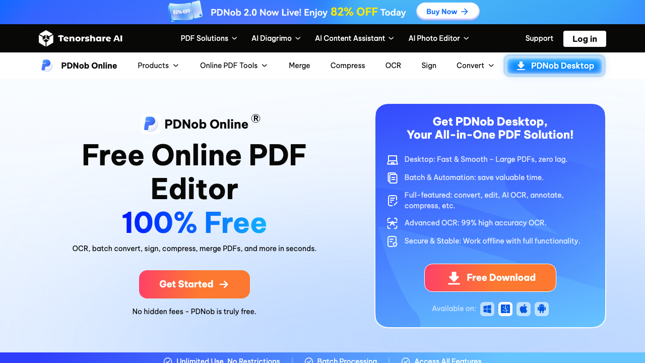 PDNob Online 是由知名软件开发商 Tenorshare 打造的一站式免费网页版 AI PDF 工具集。它以轻量化、免注册、即用即走为核心特色,为用户提供专业级的文档转换与智能提取服务。不论是学生、自由职业者还是职场办公人士,都能通过它轻松解决日常繁杂的文档处理难题。