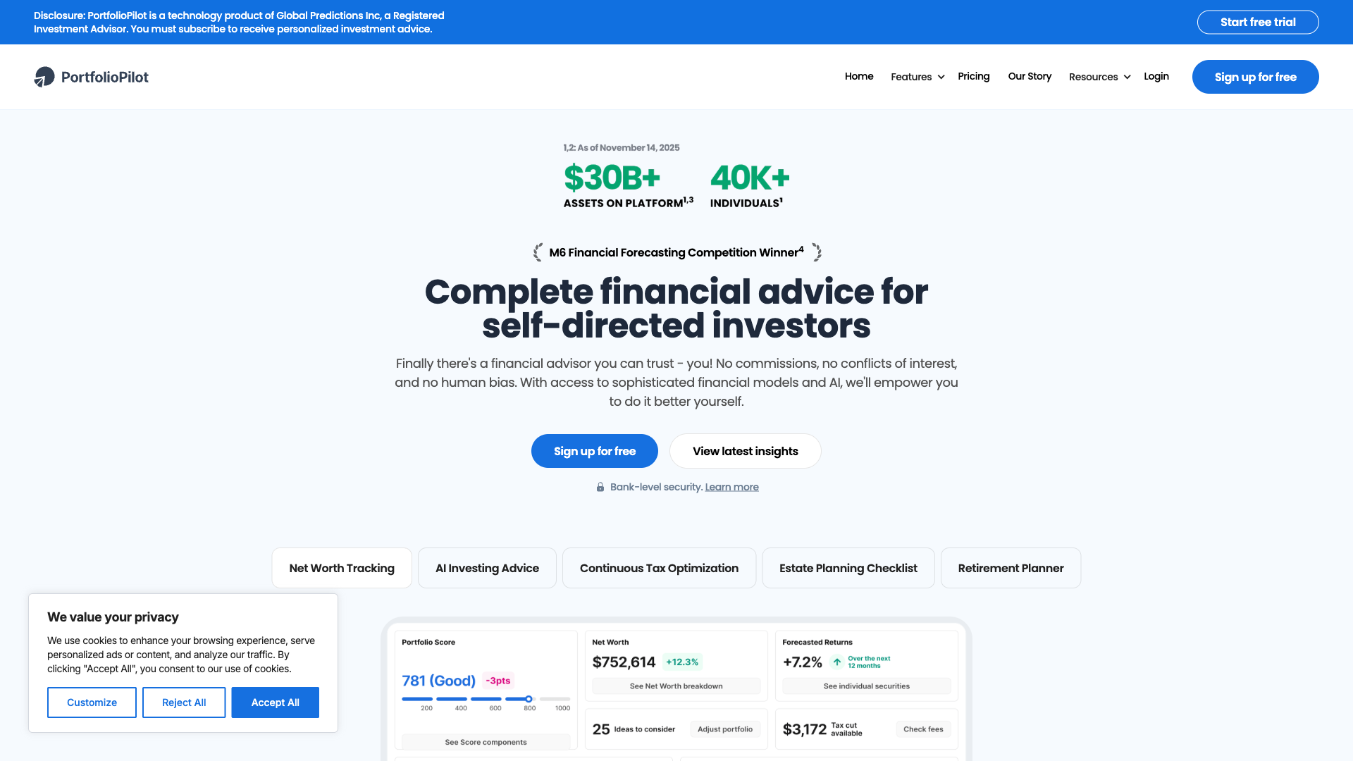 PortfolioPilot 是全球首个受 SEC 监管的 AI 金融顾问平台,由获得 M6 国际金融预测竞赛冠军的 Global Predictions 团队打造。它用对冲基金级别的经济模型和机器学习技术,为自主投资者提供每日更新的个性化投资建议,管理资产规模超过 300 亿美元。