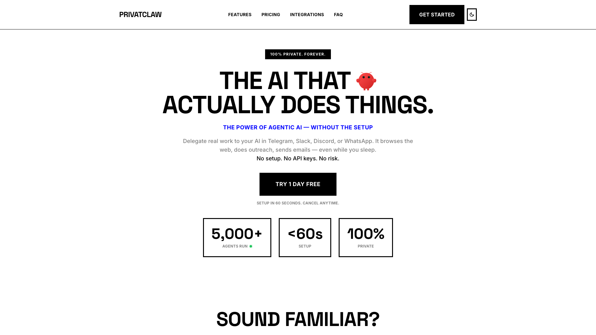 PrivatClaw 是一款隐私优先的托管式 AI 助手,基于 OpenClaw 开源框架构建,让非技术用户也能在 60 秒内通过 Telegram、Slack、Discord 或 WhatsApp 接入强大的 AI 助手。它的核心主张是:无需服务器、无需代码,同时提供比大多数托管方案更完整的隐私保护。